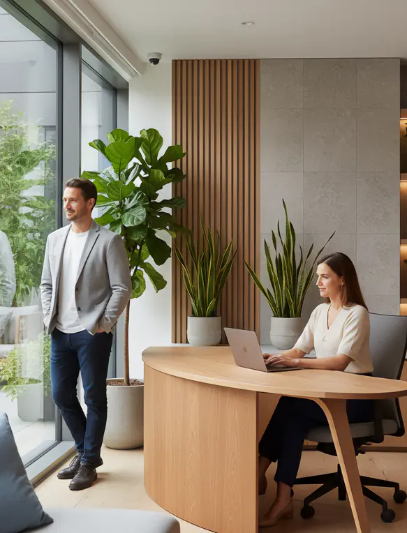 El diseño de oficinas ha evolucionado hacia un enfoque profundamente humano. La neuroarquitectura estudia cómo el entorno construido afecta nuestro cerebro y emociones. Tendencias como el uso de formas curvas, paletas de colores inspiradas en la naturaleza (verdes, azules, tonos tierra) y una iluminación adecuada demuestran reducir el estrés y mejorar la concentración.